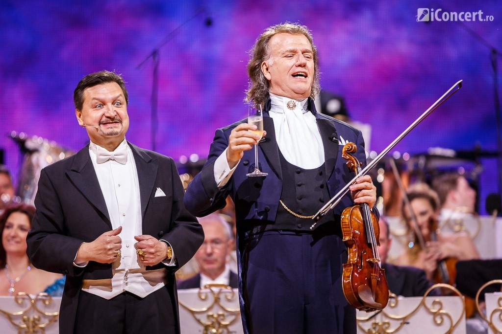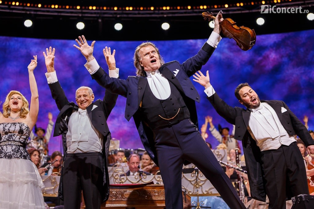Rieu e un showman care cântă ceva-ceva la vioară, ceva-ceva dirijează, dar mai mult interacţionează cu publicul şi cu oamenii de pe scenă, conform unui scenariu de stand-up comedy pe care nu mi l-aş fi închipuit vreodată în spectacolele sale. Mi s-a părut atât de trist că superba muzică în sine nu e suficientă să adune şi să ţină atâta lume pe scaune timp de trei ore fără să se plictisească şi că e nevoie de artificii precum artificii, acrobaţii cu instrumentele muzicale sau micro-scenete amuzante între membrii orchestrei. Adică, înţeleg, a existat şi comedia bufă la un moment dat în istoria muzicii mondiale, dar mai uşor cu pianul pe scări, că se dezacordează odată şi-odată. Mă-ntreb câţi dintre oamenii ăştia cărora le ardeau palmele să aplaude în ritmul muzicii, picioarele să tropăie într-un aşa-numit semn de apreciere pentru orchestră, degetele să fluiere în gură imediat la semnul lui Rieu ar fi în stare să suporte liniştea, sobrietatea, eticheta unui concert la Ateneu. Pe bune, scuipaţi-mă că-s preţioasă, dar cred că fiecare tip de muzică ar trebui să aibă publicul pe care-l merită. Şi să nu fie pervertită de manevre din astea populare de ţinut omul limitat în priză. În schimb, visualurile din fundalul scenei au fost superbe şi perfect sincronizate cu interpretarea.